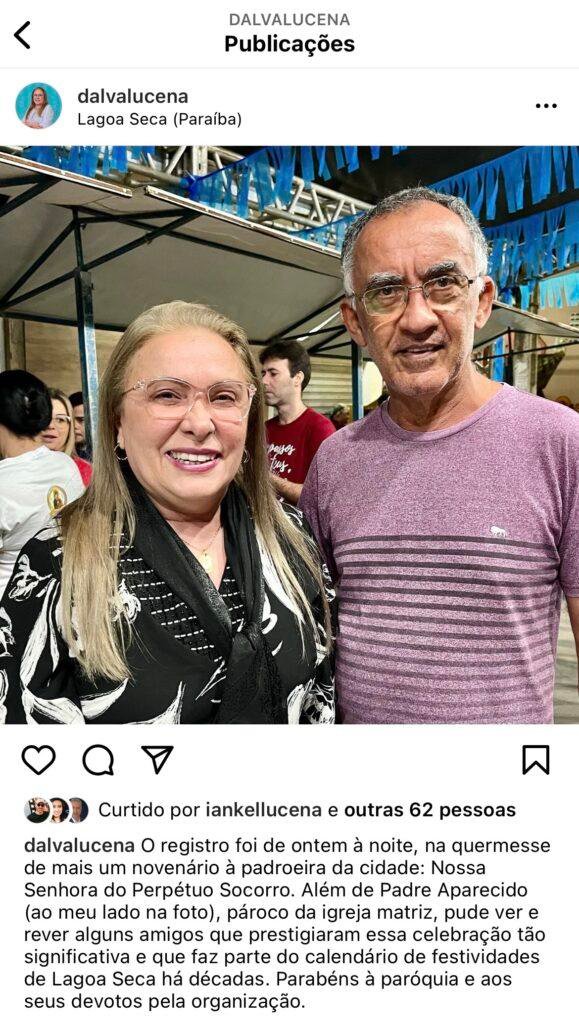 Nas redes sociais, a prefeita Dalva Lucena publicou uma foto ao lado do pároco da igreja católica, Aparecido Camargo. “Celebração tão significativa e que faz parte do calendário de festividades de Lagoa Seca há décadas”, disse a gestora.