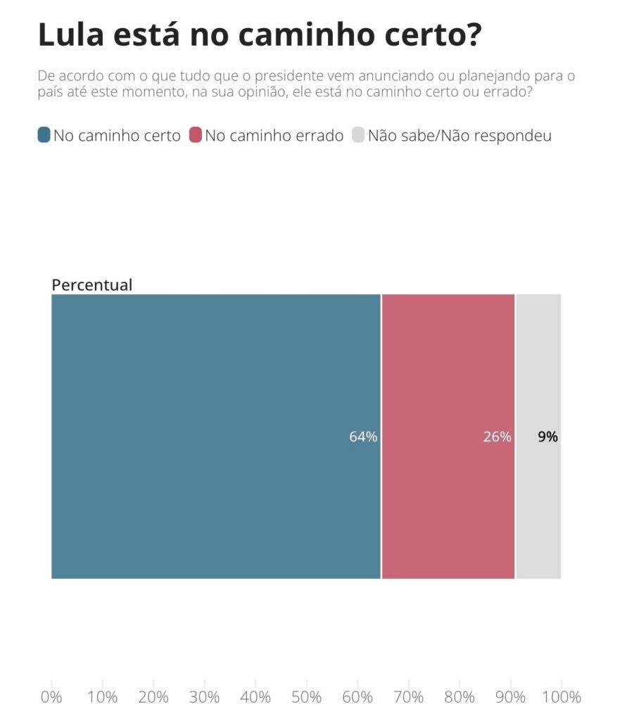 Pesquisa Ipec divulgada nesta segunda-feira (16) aponta que 64% dos entrevistados consideram que o governo do presidente Luis Inácio Lula da Silva (PT) está no caminho certo, de acordo com o que vem sendo anunciado ou planejado para o país até esse momento.