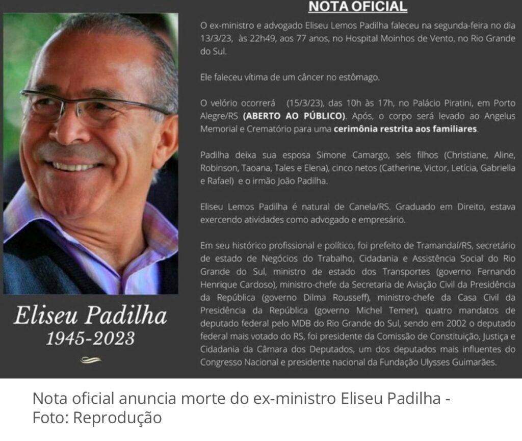 Morreu na noite desta segunda-feira (13), aos 77 anos, o ex-ministro Eliseu Padilha, informou sua assessoria. Ele fazia tratamento contra um câncer no estômago no Hospital Moinhos de Vento, em Porto Alegre. Padilha deixa a mulher e seis filhos. Ainda não há informações sobre o velório.
