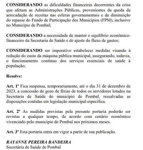 A determinação está no Diário Oficial dos Municípios e diz que “as dificuldades financeiras decorrentes da crise que afetam as Administrações Públicas, provenientes da queda da arrecadação de receitas nas esferas governamentais e da diminuição do repasse do Fundo de Participação dos Municípios (FPM), inclusive no Município de Pombal”.
