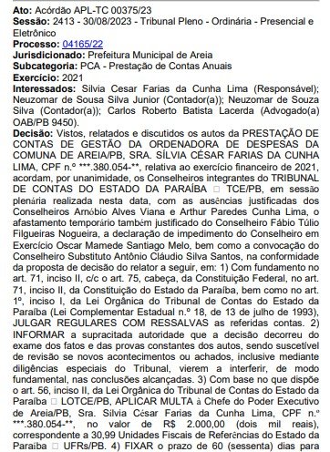 O Tribunal de Contas do Estado da Paraíba (TCE-PB) multou em R$ 2 mil a prefeita da cidade de Areia, Sívia Cesar Farias da Cunha Lima por contratações irregulares para o quadro funcional da Prefeitura da cidade e determinou a admissão de candidatos aprovados no Concurso Público nº. 02/2023, o último realizado.