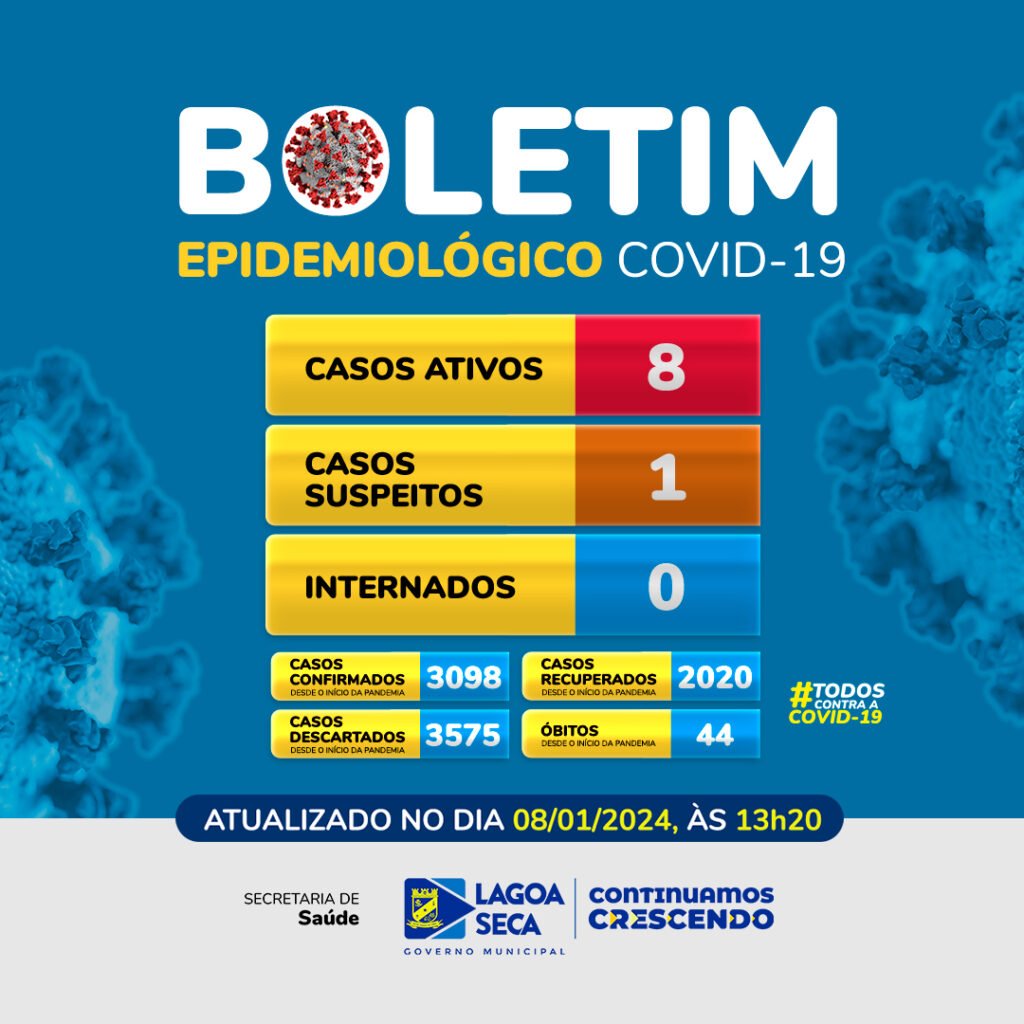 De acordo com boletim epidemiológico publicado nesta segunda-feira (8) pela Secretaria de Saúde, Lagoa Seca possui atualmente 8 casos ativos de Covid-19. Destes, 6 são mulheres e 2 homens, com faixa etária entre 29 a 47 anos.