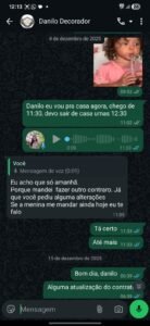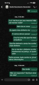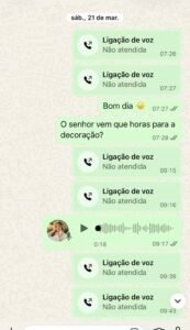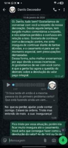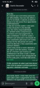 Conforme o relato, o contrato foi enviado inicialmente por WhatsApp, mas o decorador não chegou a assinar formalmente, alegando que levaria o documento pessoalmente – o que nunca aconteceu.
